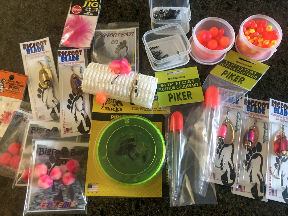 Bouncing roe, throwing a spinner, or a float rod set-up, this Big Foot Bait Co. tackle kit filled with leaders organized in a leader case, beads, bobbers, spinners, puff balls with yarnies, weights, swivels, and enough pink and purple tackle to catch the attention of the wildest steelhead.