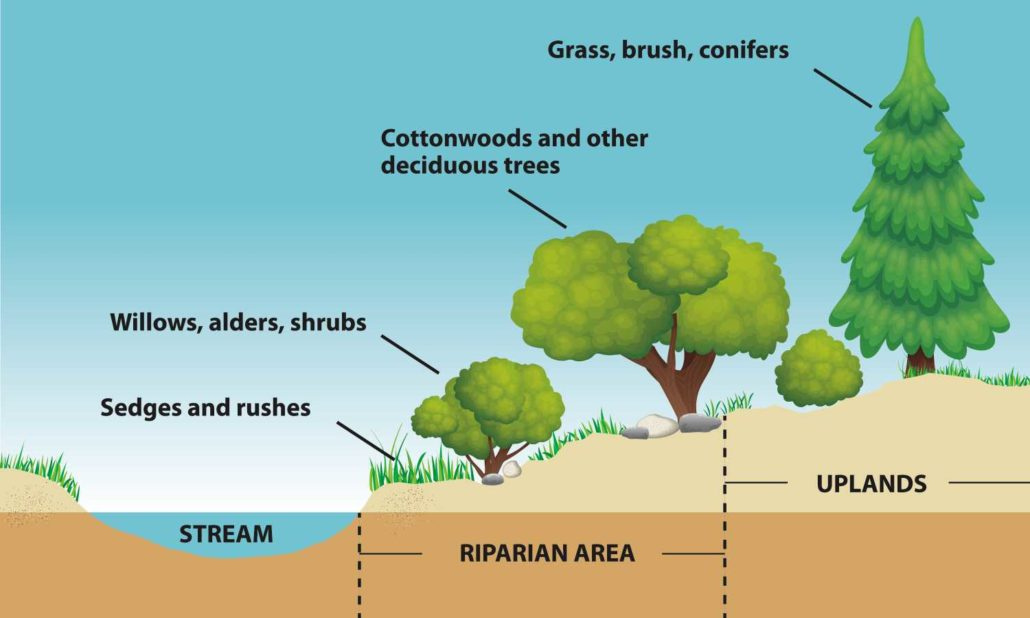 - Riparian zones (the area where land and a river or stream meet) weaken